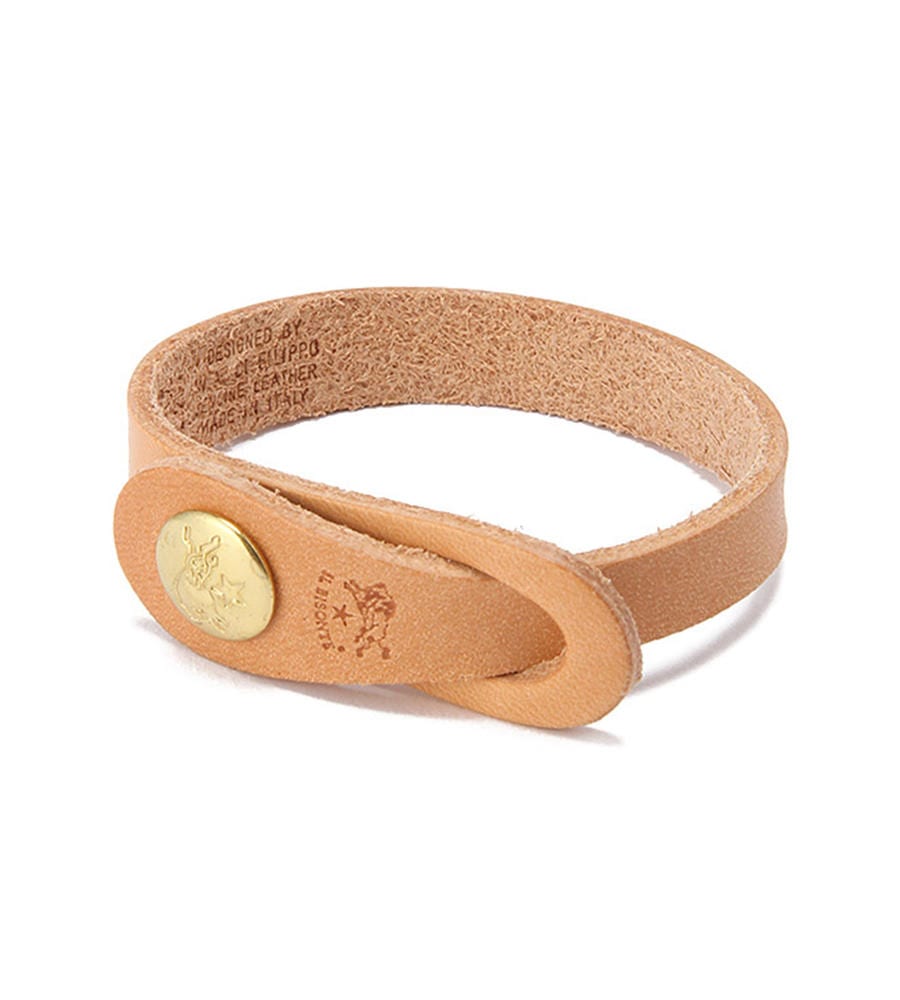 オリジナルのバケットレザーにロゴの刻印をあしらったシンプルなブレスレット。天然レザーならではのナチュラルな風合いが魅力です。豊富なカラー展開。スナップボタン式で着脱しやすいのもGOOD。