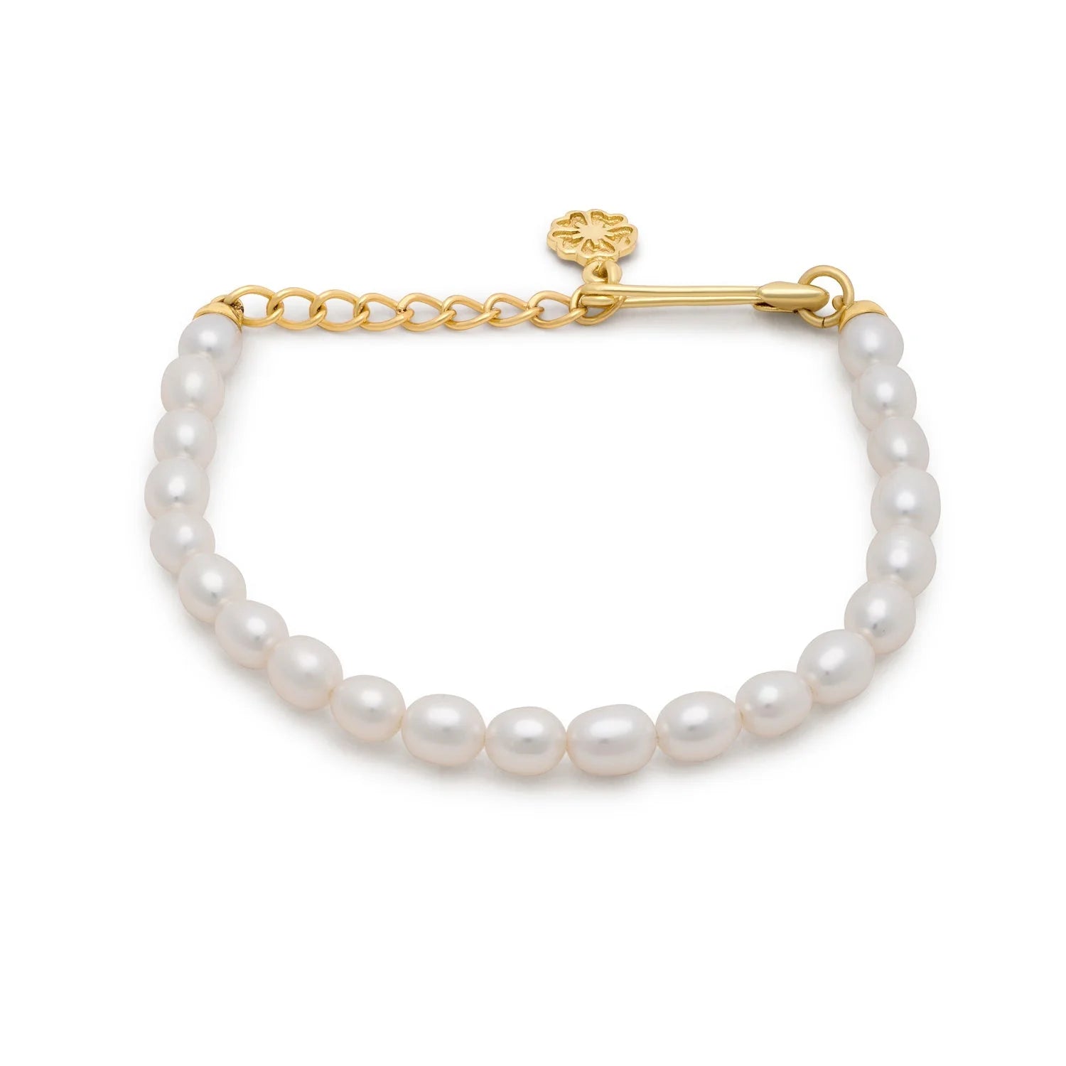 ほどよいボリューム感を持つ淡水パールに、安全ピンモチーフを留め具にプラスしたパールブレスレット。パールにゴールドチェーンのおしゃれなコントラスト、おしゃれなパーツ使いはAZUNIならではのデザイン。
