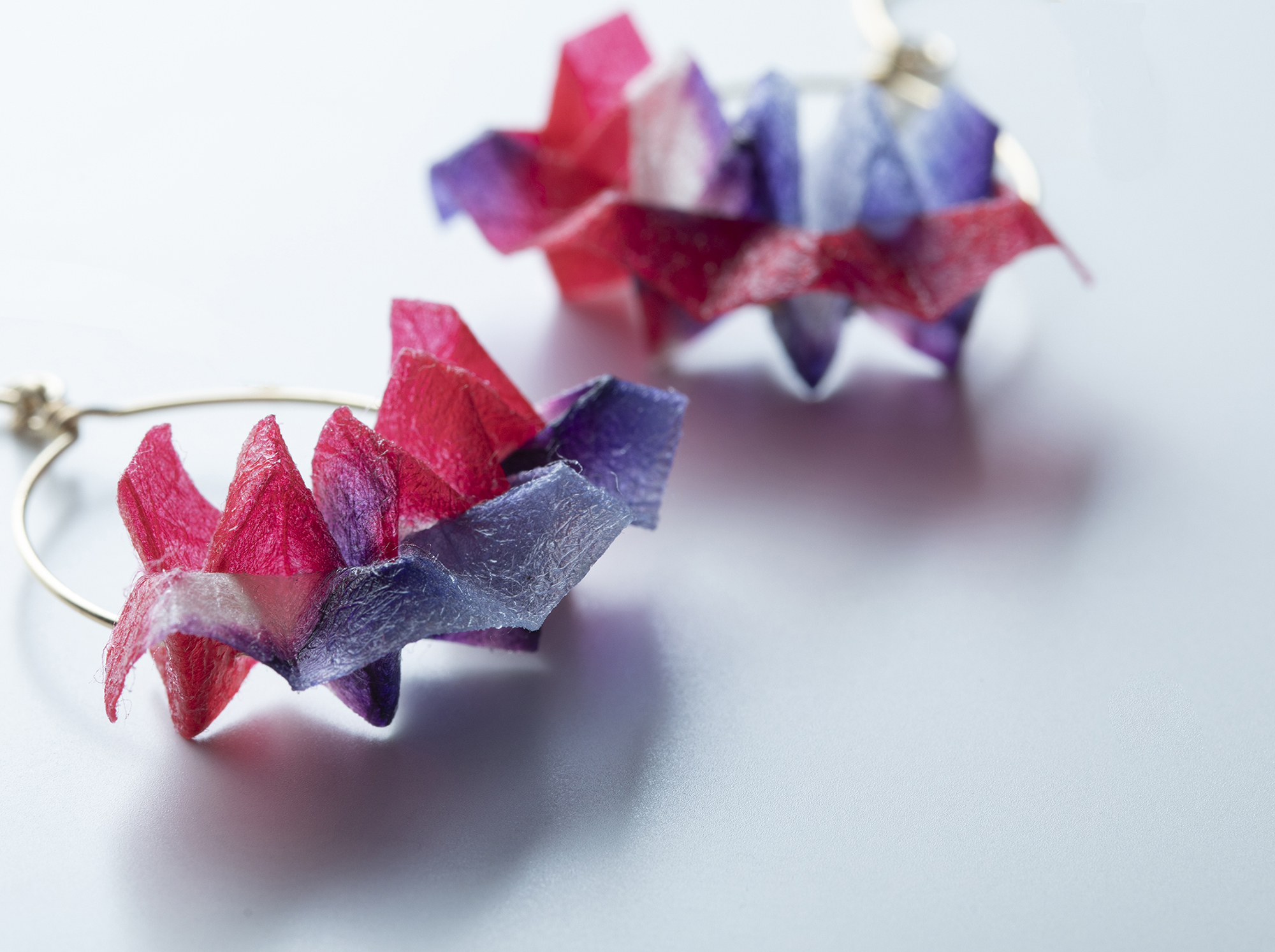 板締め絞りを和紙に施したイヤリング。石川県の伝統工芸「二俣和紙」を使用。ただ珍しいだけでなく、一つひとつ色合いの異なる一点ものは特別感もありますね。海外のお友達へのお土産にもGOOD!
