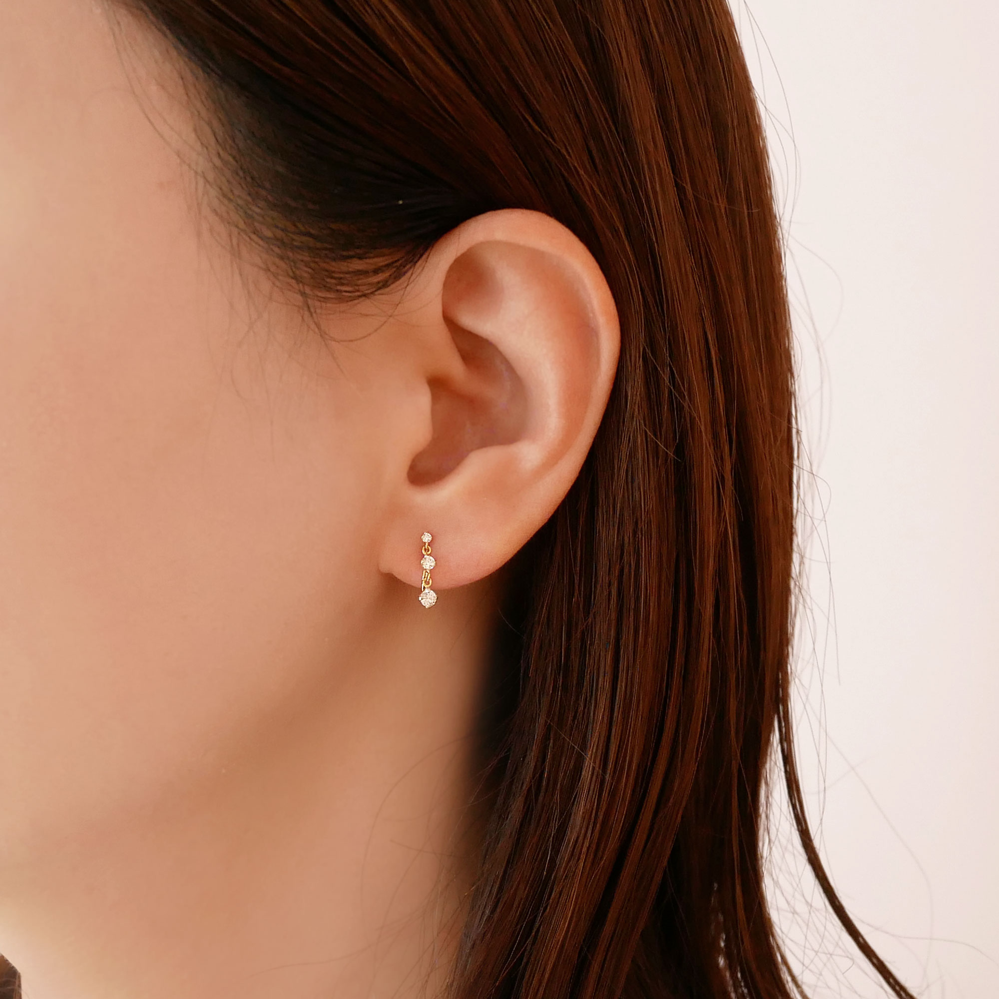 小さなストーンが3つ並んだフェミニンなイヤリング。一番小さなストーンがダイヤモンド、後には2つのキュービックジルコニア連なります。一見ピアスに間違えるほど、とっても華奢なデザインが高ポイント!