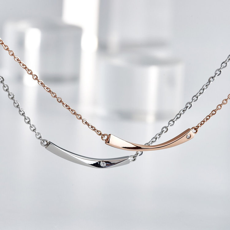 おすすめは、”永遠の愛”の石言葉を持つダイヤモンドを一粒あしらったペアネックレス。シンプルながらも遊びゴコロがあり、コーディネートのアクセントになります。レディースはピンクゴールド、メンズはシルバーのリンクジュエリーに。