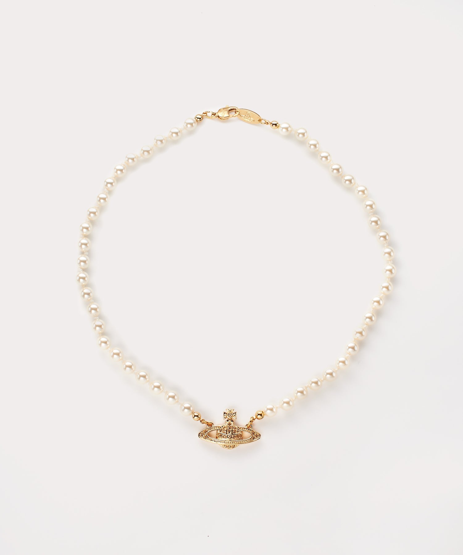 ペンダントトップにブランドアイコンORBにラインストーンをあしらい、パールチェーンできらびやかにつないだデザイン。大胆なデザインの中に上品さも兼ね備えています。身につけるだけで一気に華やかな雰囲気に。